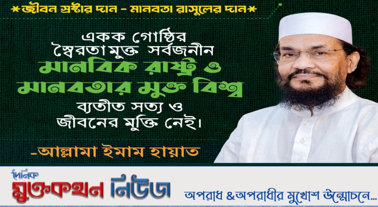 আল্লামা ইমাম হায়াত বলেন, খুনিদের দল ঘৃনাভরে বর্জন করুন, খুনিদের দলে থাকলে আপনিও খুনের অংশিদার এবং দয়াময় স্রষ্টা ও তাঁর মহান রাসুলের শত্রু। একক গোষ্ঠির স্বৈরতামুক্ত সর্বজনীন মানবিক রাষ্ট্র ও মানবতার মুক্ত বিশ্ব ব্যতীত সত্য ও জীবনের মুক্তি নেই। জীবন ও মানবতার বিরুদ্ধে কোন ধর্ম হয় না, ধর্মের ছদ্মনামে অধর্ম হয়। ঈমানদার হতে হলে ঈমানী জাতীয়তার ধারক হতে হবে। ঈমানদার হতে হলে বস্তুবাদী জাতীয়তাবাদ থেকে মুক্ত থাকতে হবে। মানুষ দাবি করতে হলেও বস্তুবাদি চেতনা ও বস্তুবাদি জাতীয়তাবাদ থেকে মুক্ত থেকে বস্তুবাদের উর্ধে মানবসত্তায় বিশ্বাস ও অখন্ড প্রাকৃতিক মানব জাতীয়তার ধারক হতে হবে। ভাষাগত পরিচয়, রাষ্ট্রীয় নাগরিকত্ব আর মূল আত্ম পরিচয় তথা জাতীয়তা এক বিষয় নয় সম্পূর্ণ ভিন্ন বিষয়। ঈমানীসত্তা ও বস্তুবাদি সত্তা বিপরীত সত্তা। মানবসত্তা ও বস্তুবাদি সত্তা বিপরীত সত্তা। ভাষাগত জাতীয়তাবাদ, গোত্রগত জাতীয়তাবাদ, রাষ্ট্রগত জাতীয়তাবাদ সবই বস্তুবাদি জাতীয়তাবাদের এক একটি শাখা যা জীবন সত্যের বিপরীত। জীবনের সত্য এই যে, জীবন বস্তুর উর্ধে গন্ডীর উর্ধে একমাত্র জীবনের দয়াময় স্রষ্টার নামে ও স্রষ্টার আলো মহান রেসালাতের আলোকে হতে হবে, নাহয় জীবন নাস্তিক্যউদ্ভূত বস্তুবাদের আঁধারে মিথ্যার অংশ হয়ে যাবে।