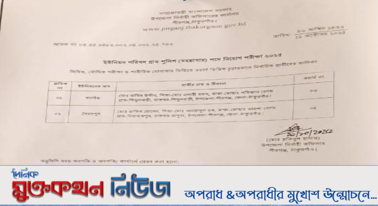 ঠাকুরগাঁওয়ে প্রতিনিধি,হাসিনুজ্জামান মিন্টু : ঠাকুরগাঁও জেলার পীরগঞ্জ উপজেলার ৫ নং সৈয়দপুর ইউনিয়নে অনুষ্ঠিত গ্রামপুলিশ নিয়োগ পরীক্ষায় ঘুষের বিনিময়ে চাকরি দেওয়ার ভয়াবহ অভিযোগ উঠেছে। স্থানীয় সূত্র ও পরীক্ষায় অংশগ্রহণকারী একাধিক প্রার্থী জানান, এই নিয়োগে মেধা নয়, টাকা-ই ছিল প্রধান যোগ্যতা।