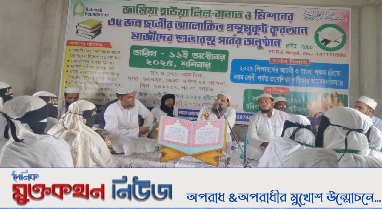 জামিয়া হাউয়া লিল-বানাত ও মিশনের ৩৫ জন ছাত্রীর আলোকিত গ্রন্থ মুকুট কুরআন মাজীদের শুভারম্ভ পর্বের অনুষ্ঠানের সূচনা করেন দক্ষিণ চব্বিশ পরগনা জেলার জমিয়েত ওলামা হিন্দদের সাধারণ সম্পাদক মুফতি আমিন উদ্দিন সরদার।জামিয়া হাউয়া লিল-বানাত ও মিশনের পক্ষ থেকে ৩৫জনছাত্রীর আলোকিত গ্রন্থ মুকুট কুরআন মাজীদের শুভারম্ভ উপলক্ষে একটি দোওয়ার মজলিস অনুষ্ঠিত হয়। এই মহিলা মাদ্রাসার পক্ষথেকে ৩৫জন ছাত্রীকে মাদ্রাসা কর্তৃপক্ষ তাদের হাতে একটি করে কোরান শরীফ সেই সঙ্গে একটি করে মেসওয়াক তুলেদেন প্রতিটি ছাত্রীর হাতে। দক্ষিণ চব্বিশ পরগনা জেলার জমিয়েত ওলামা হিন্দদের সাধারণ সম্পাদক মুফতি আমিন উদ্দিন সাহেব তিনি প্রথমে দুই একজন ছাত্রীর মুখ দিয়ে আম্বাপারা থেকে আয়াত শোনেন ।এর পর তিনি কোরান শরীফ সবাইকে খুলতে বললেন এবং পড়ানো শুরু করেন।এই মহতী অনুষ্ঠান