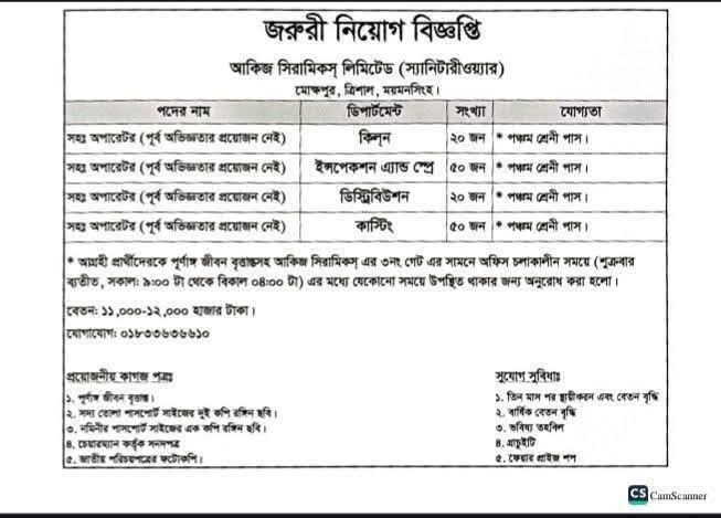 ময়মনসিংহের ত্রিশাল উপজেলার মোক্ষপুরে অবস্থিত দেশের অন্যতম শিল্প প্রতিষ্ঠান আকিজ সিরামিকস লিমিটেড (স্যানিটারি ওয়্যার বিভাগ) সম্প্রতি বেশ কয়েকটি পদে বিপুল সংখ্যক লোকবল নিয়োগের ঘোষণা দিয়েছে।