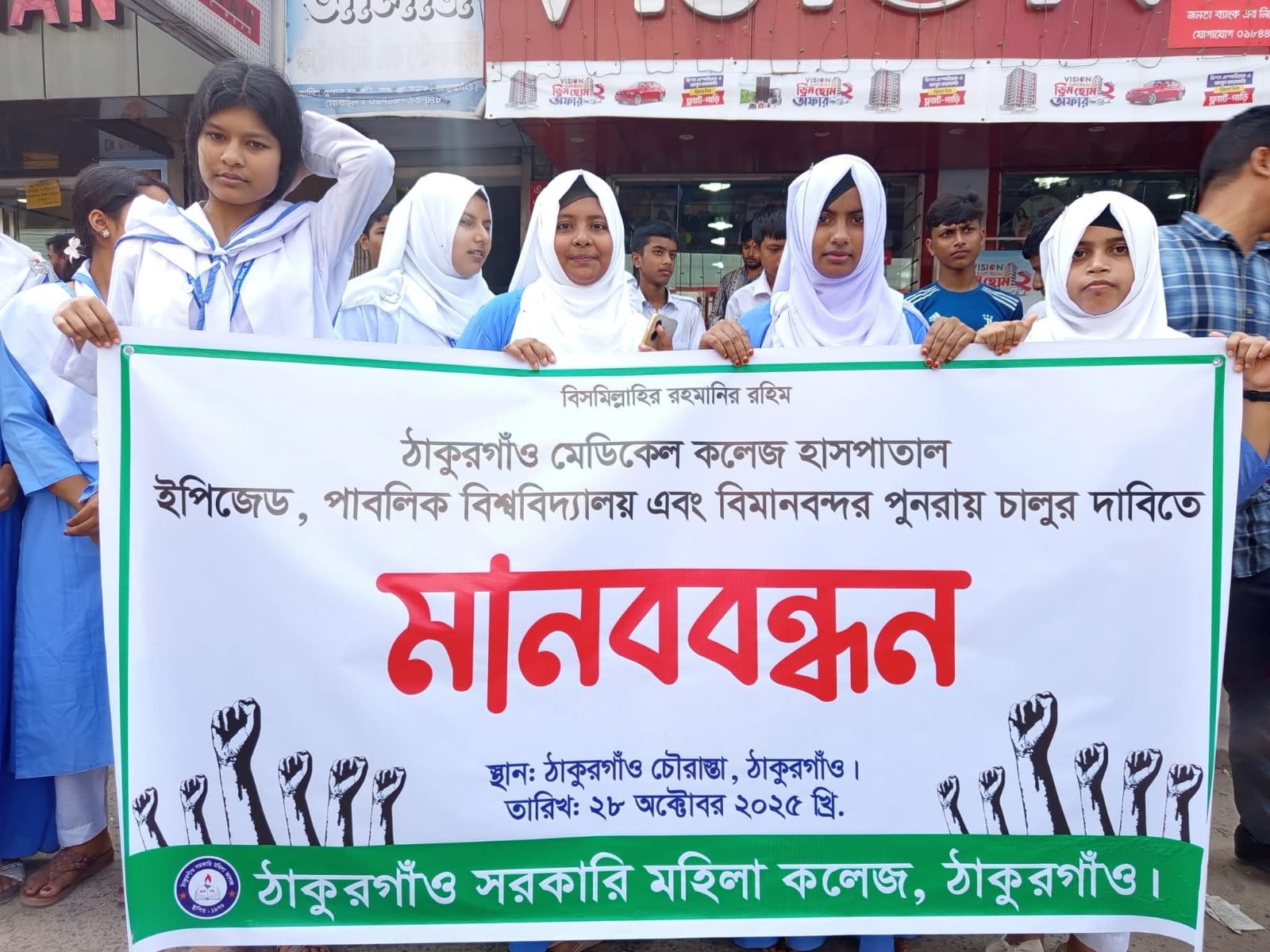 মানববন্ধনে বক্তারা বলেন, দীর্ঘদিন ধরে ঠাকুরগাঁওবাসীর দাবি থাকা সত্ত্বেও মেডিকেল কলেজ হাসপাতাল চালু, বিমানবন্দর কার্যক্রম পুনরায় শুরু ও শিল্প উন্নয়নের জন্য ইপিজেড প্রতিষ্ঠা হয়নি। দ্রুত এসব দাবি বাস্তবায়নের জন্য সরকারের প্রতি জোর আহ্বান জানান তারা।