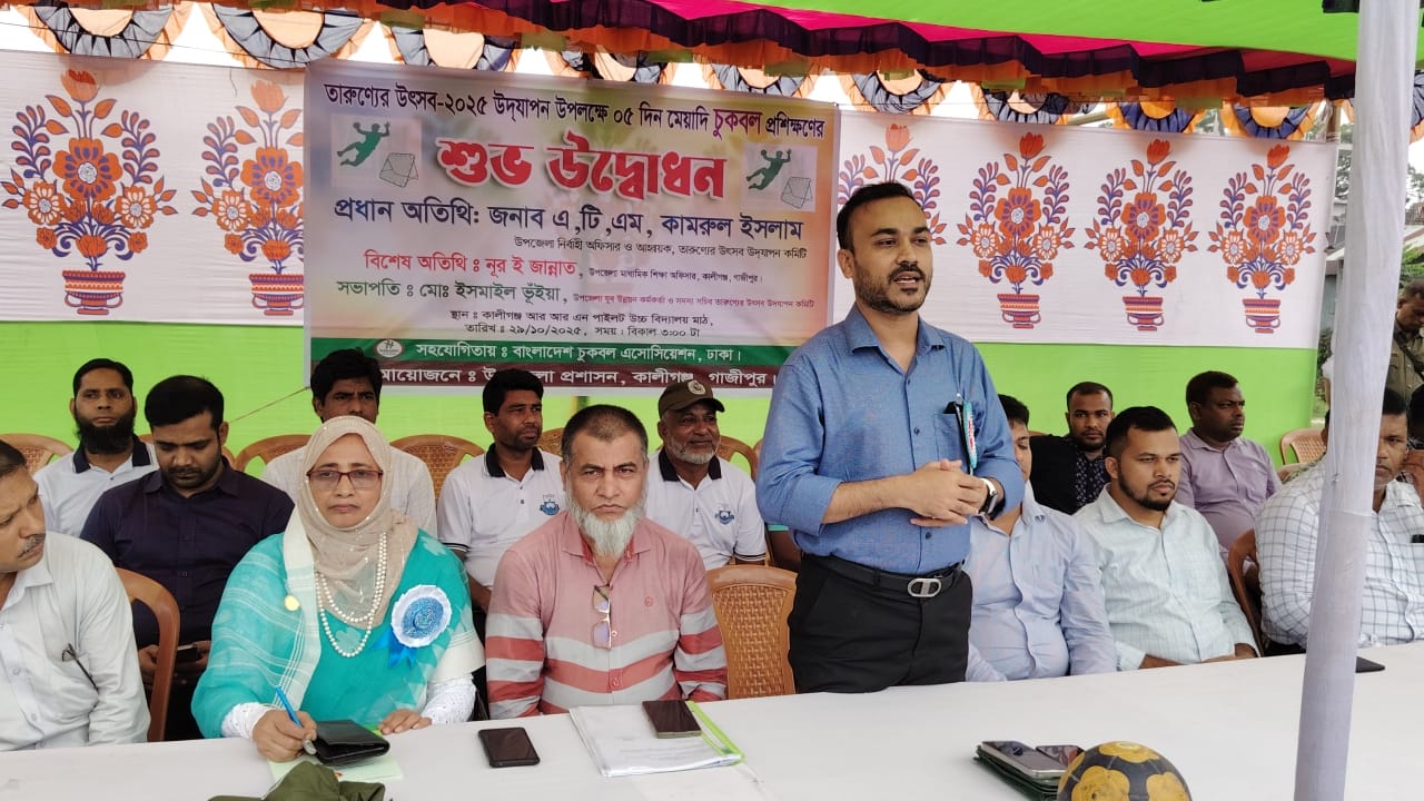 মোঃ মুক্তাদির হোসেন,স্টাফ রিপোর্টার: গাজীপুরের কালীগঞ্জে তারুণ্যের উৎসব-২০২৫ উদযাপন উপলক্ষ্যে উপজেলা প্রশাসনের আয়োজনে বাংলাদেশ চুকবল এসোসিয়েশনের সহযোগিতায় পাঁচদিন ব্যাপী চুকবল প্রশিক্ষণের উদ্বোধন করা হয়েছে।