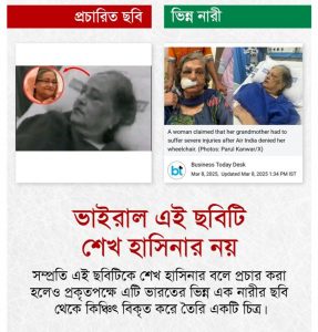 ওয়েবসাইটে ২০২৫ সালের ৮ মার্চ প্রকাশিত একটি রিপোর্টে উক্ত ছবির মত একটি ছবি পাওয়া যায়। সেখানে শেখ হাসিনা নয় বরং, ভিন্ন এক নারীকে দেখতে পাওয়া যায়। এই নারীর মুখের শেখ হাসিনার ছবি যুক্ত করে বিকৃত করা হয়েছে।