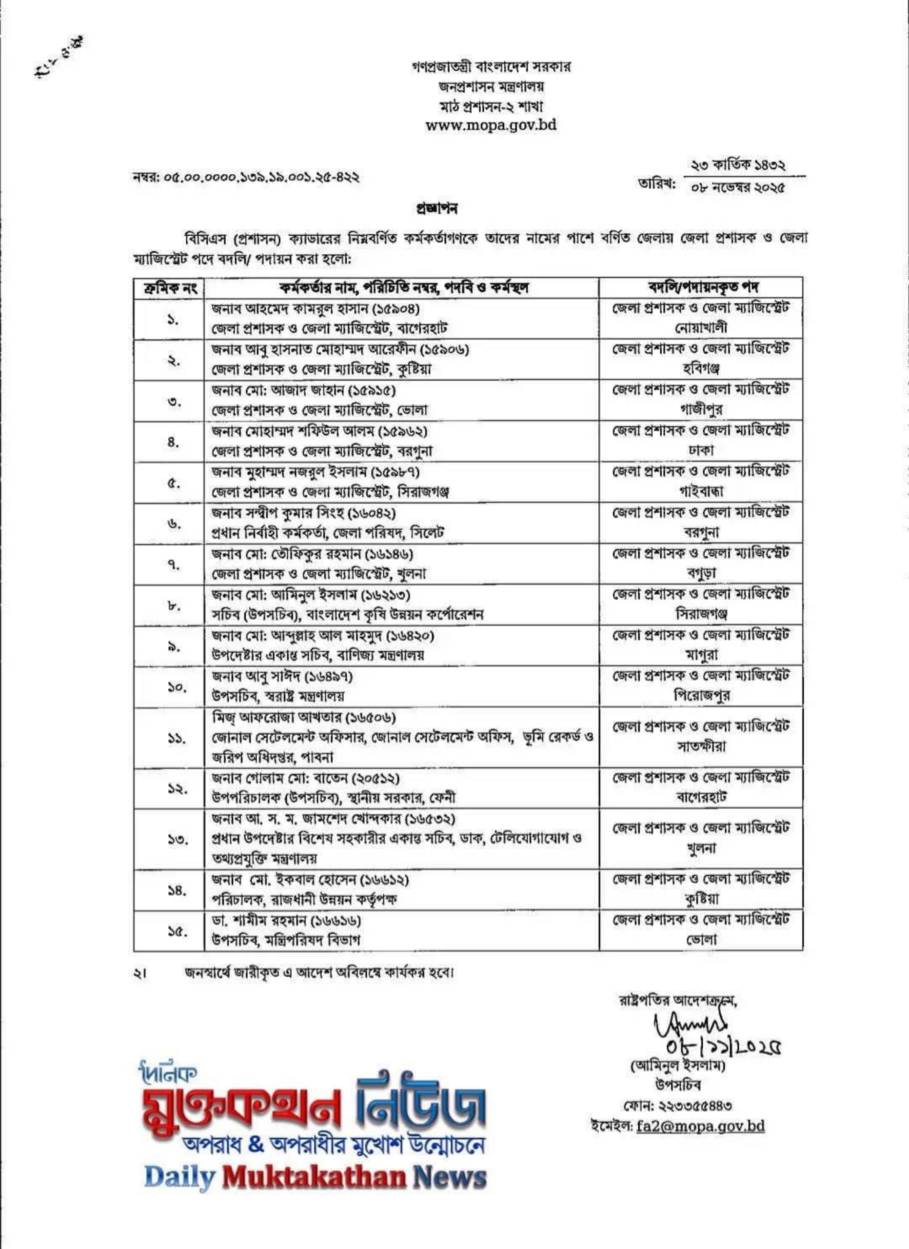 📰 সূত্র: জনপ্রশাসন মন্ত্রণালয়, মাঠ প্রশাসন-২ শাখা