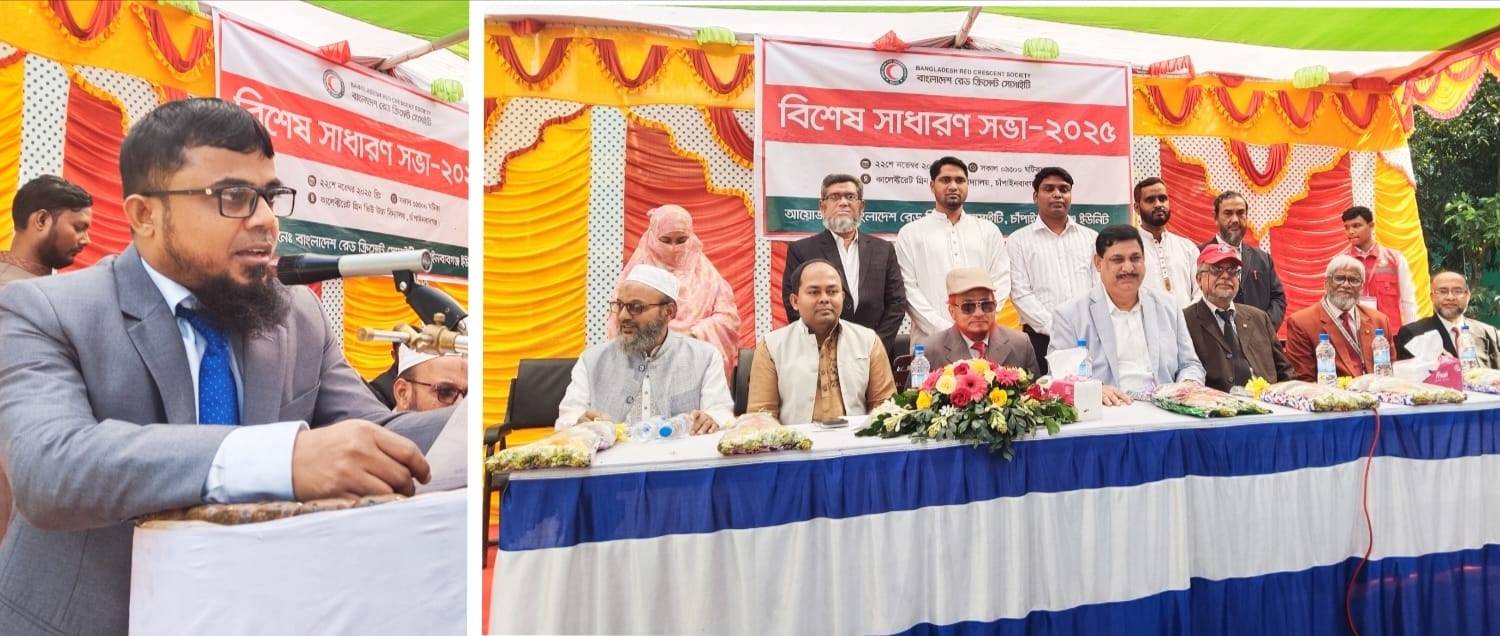 মাহিদুল ইসলাম ফরহাদ,চাঁপাইনবাবগঞ্জ জেলা প্রতিনিধিঃ বাংলাদেশ রেড ক্রিসেন্ট সোসাইটি চাঁপাইনবাবগঞ্জ ইউনিটে এক বিশেষ সাধারণ সভার আয়োজন করা হয়েছে।(২২ নভেম্বর) শনিবার সকাল ১০ ঘটিকায় কালেক্টরেট গ্রিন ভিউ উচ্চ বিদ্যালয় মাঠ প্রাঙ্গণে বিশেষ সাধারণ সভা অনুষ্ঠিত হয়। উক্ত অনুষ্ঠানে সভাপতিত্ব করেন, আহবায়ক কমিটির ভাইস-চেয়ারম্যান ও চেম্বার অব কমার্স এন্ড ইন্ডাস্ট্রি সভাপতি আব্দুল ওয়াহেদ।উক্ত বিশেষ সাধারণ সভার বক্তব্য দেন,বাংলাদেশ রেড ক্রিসেন্ট জেলা ইউনিটের নবনির্বাচিত চেয়ারম্যান জেলা প্রশাসক ও জেলা ম্যাজিস্ট্রেট মোঃ শাহাদাত হোসেন মাসুদ। বাংলাদেশ রেড ক্রিসেন্ট চাঁপাইনবাবগঞ্জ ইউনিটের কার্যনির্বাহী কমিটির ২০২৫-২০২৭ দ্বি-বার্ষিক নির্বাচনে নবনির্বাচিতদের নাম প্রকাশ করে আহবায়ক কমিটির নির্বাচন কমিশনার অতিরিক্ত জেলা ম্যাজিস্ট্রেট মোঃ আনিসুর রহমান। কার্যনির্বাহী কমিটির প্রতিটি পদে একাধিক প্রার্থী না থাকায় উক্ত প্রার্থীদের আগামী দুই বছর মেয়াদের জন্য চুড়ান্ত ইউনিট কার্যনির্বাহী কমিটি ঘোষণা করেন। বাংলাদেশ রেড ক্রিসেন্ট চাঁপাইনবাবগঞ্জ ইউনিটে ভাইস- চেয়ারম্যান পদে নির্বাচিত হলেন এ্যাডভোকেট নূরে আলম সিদ্দিকী আসাদ, সেক্রেটারি পদে নির্বাচিত হলেন চাঁপাইনবাবগঞ্জ চেম্বার অফ কমার্স ইন্ডাস্ট্রি সহ-সভাপতি মোঃ খাইরুল ইসলাম,উক্ত নবনির্বাচিত ৫ জন নির্বাহী সদস্য পদে নির্বাচিত হলেন, মফিজ উদ্দিন, রোজিনা সুলতানা, আব্দুল রাজ্জাক, তোহুরুল ইসলাম সোহল ও মানিক রায়হান। এছাড়াও আরোও উপস্থিত ছিলেন, আইনজীবি সমিতির সভাপতি এ্যাডভোকেট মহাম্মদ ইসাহাক, ডাঃ ময়েজ উদ্দিন, সিনিয়র সাংবাদিক গোলাম মোস্তফা মন্টু প্রমুখ।