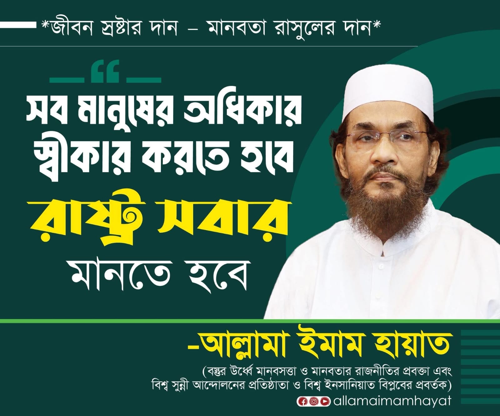 জীবনের নিরাপত্তা ও জীবনের স্বাধীনতা এবং ধর্মের মানবিক মূল্যবোধ ও গণতন্ত্র ছাড়া রাষ্ট্র একক গোষ্ঠীবাদি হিংস্র পাশবিক সাম্প্রদায়িক স্বৈররাজনীতির জবরদখলে রুদ্ধ ও ধ্বংস হয়ে যাবে বলে আল্লামা ইমাম হায়াত জনগণকে সতর্ক করেছেন।