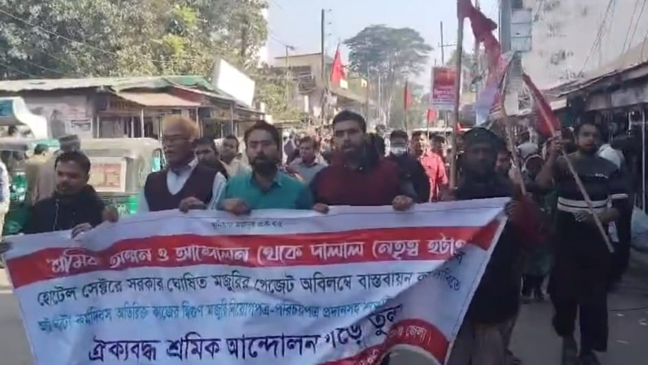 সুনামগঞ্জ প্রতিনিধিঃ সারাদেশের ন্যায় হোটেল সেক্টরে সরকার ঘোষিত মজুরির গেজেট বাস্তবায়নের দাবিতে সুনামগঞ্জে বিক্ষোভ মিছিল ও সমাবেশ অনুষ্ঠিত হয়েছে।