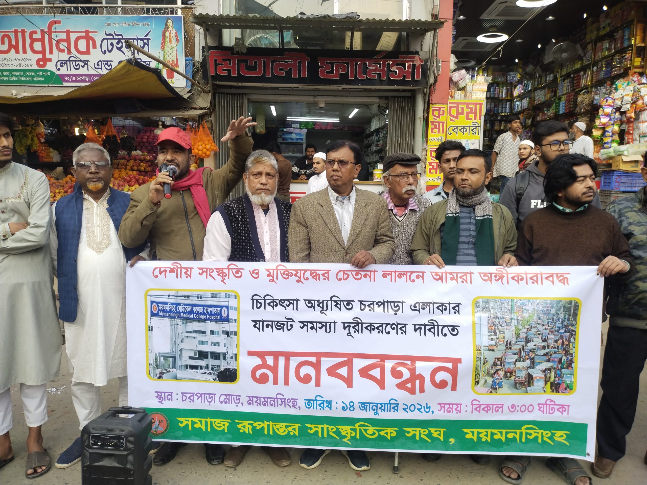 মকবুল হোসেন, ময়মনসিংহ জেলা প্রতিনিধিঃ ময়মনসিংহ নগরীর চিকিৎসা অধ্যূষিত ব্যস্ততম চরপাড়া এলাকায় যানজট সমস্যা নিরসনের দাবী জানিয়েছে সমাজ রূপান্তর সাংস্কৃতিক সংঘ,সংগঠনটি আজ ১৪ জানুয়ারি ২০২৬ বুধবারম বিকাল ৩ টায় ঘন্টাব্যাপী নগরীর চরপাড়া মোড়ে মানববন্ধন করেছে। মানববন্ধনে উপস্থিত বক্তারা বলেন, চরপাড়া এলাকা বৃহত্তর ময়মনসিংহ অঞ্চল ও পার্শ্ববর্তী অন্যান্য অঞ্চলের চিকিৎসার প্রধান ভরসাস্থল। এখানে ময়মনসিংহ মেডিক্যাল কলেজ ও হাসাপাতালসহ অর্ধ শতাধিক বেসরকারী হাসপাতালে চিকিৎসা সেবা করে আসছে।