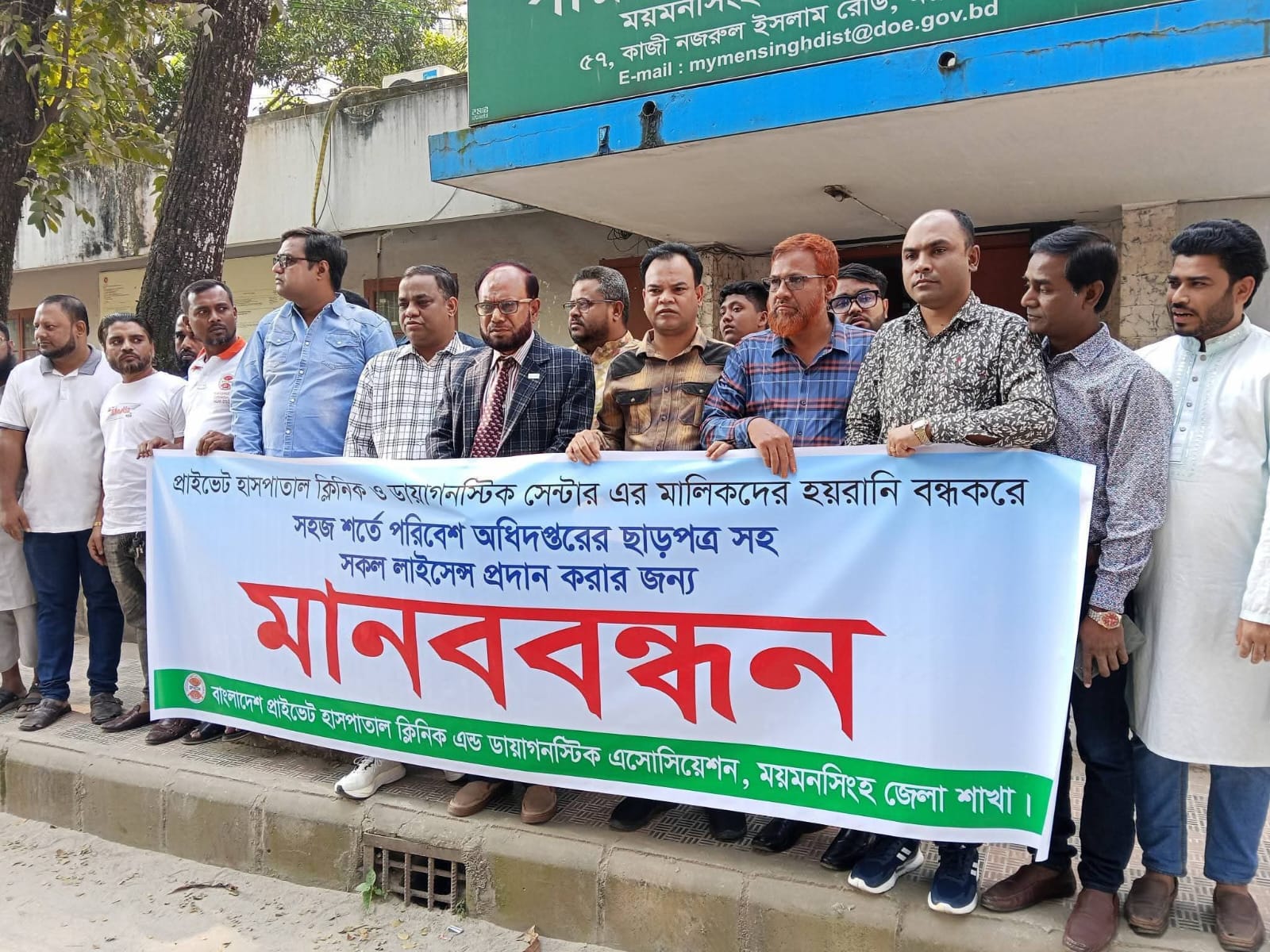 ময়মনসিংহে পরিবেশ অধিদপ্তরের সামনে প্রাইভেট হাসপাতাল মালিকদের মানববন্ধন